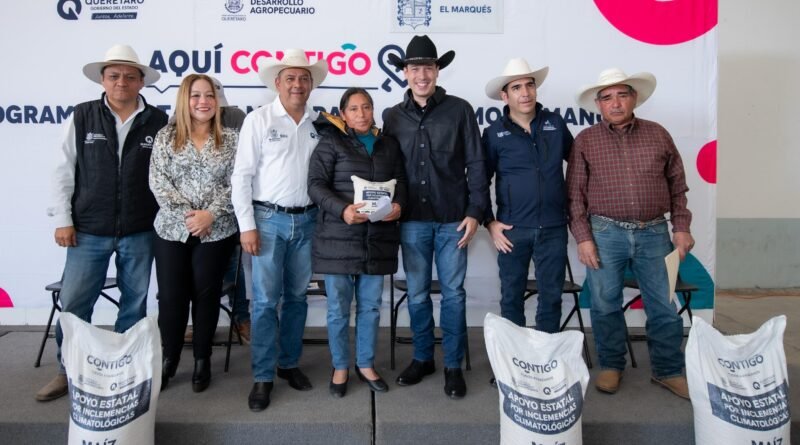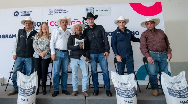 El presidente municipal de El Marqués, Rodrigo Monsalvo Castelán, junto con el secretario de Desarrollo Agropecuario (SEDEA) del estado de Querétaro, Rosendo Anaya Aguilar, encabezaron la entrega de 479 toneladas de grano de maíz para consumo humano a productores locales durante 2025 por el cambio climático.
